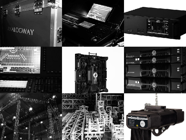 lighting desk, led screen display, processor, electric motors, truss and stage