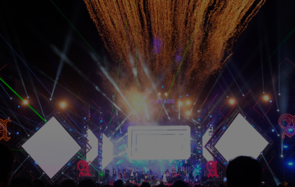 lighting desk, led screen display, processor, electric motors, truss and stage