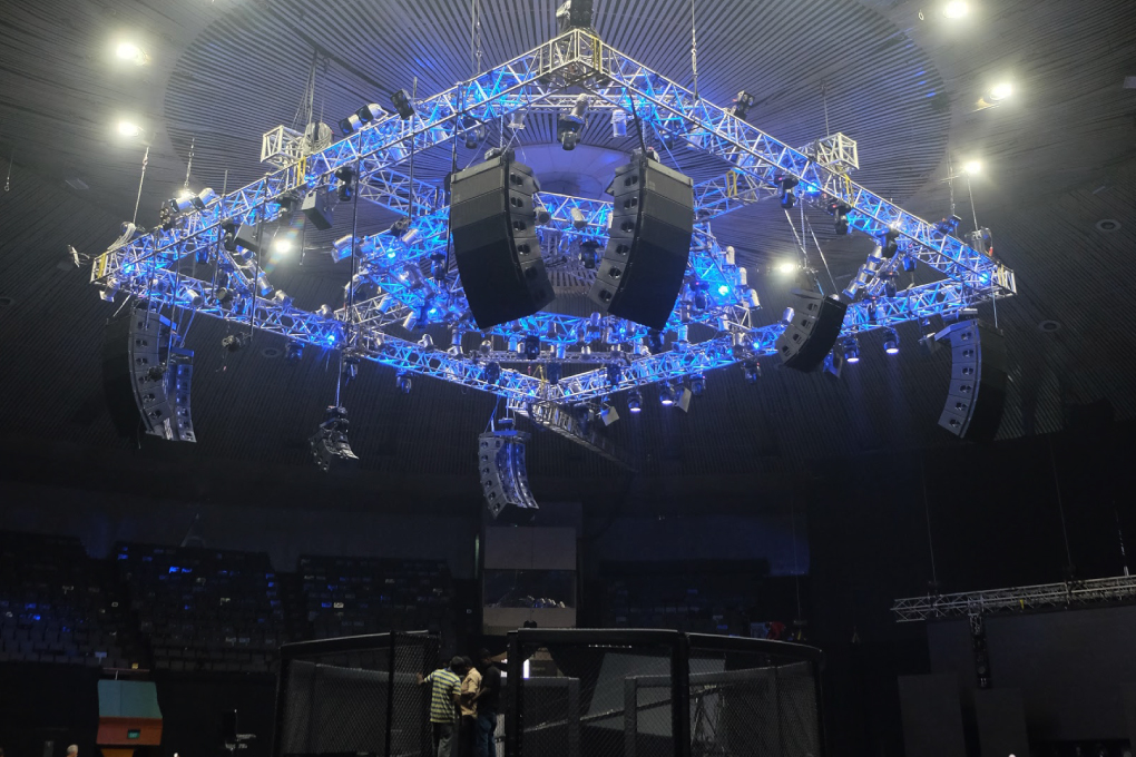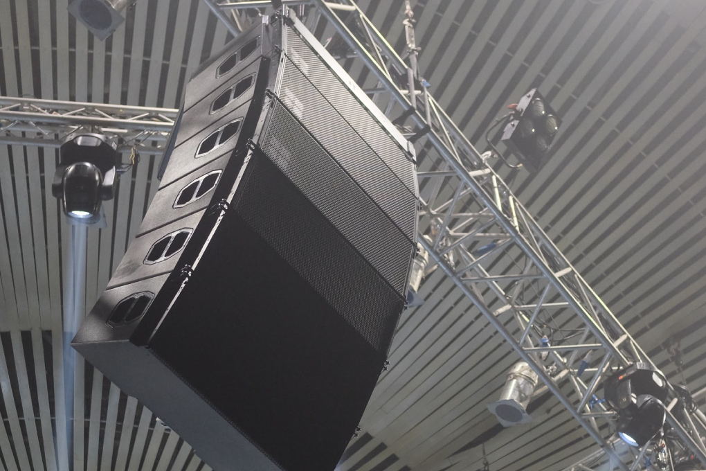 lighting desk, led screen display, processor, electric motors, truss and stage