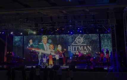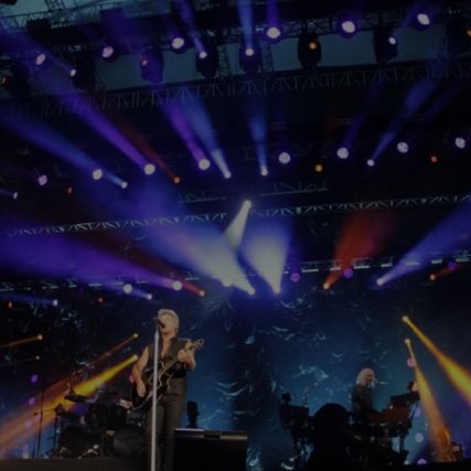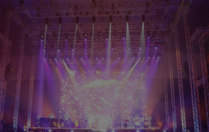 lighting desk, led screen display, processor, electric motors, truss and stage