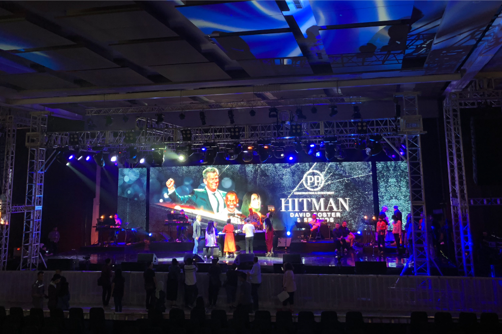 lighting desk, led screen display, processor, electric motors, truss and stage